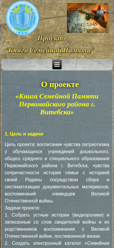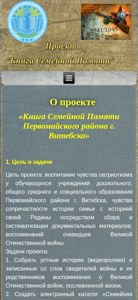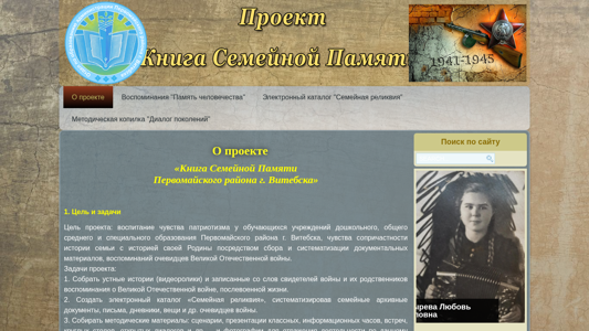 --- The portal "Chronicles of G8 Vitby" is dedicated to the Project "Book of Family Memory" in the First May District of the city of Vitebsk, Belarus. The project aims to instill a sense of patriotism in students of preschools, primary, secondary and vocational schools in the First May District of Vitebsk, by collecting and organizing documentary materials and personal recollections of witnesses and their relatives of the Great Patriotic War and post-war life. The portal includes an electronic catalog "Family Relic," a methodological collection "Dialogue of Generations," and a presentation of the project for educational workers in the First May District of Vitebsk. The project was initiated by the Education Department of the First May District Administration of Vitebsk and is based on a search project "People's Memory – Human Memory. Book of Family Memory," developed