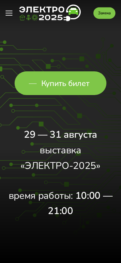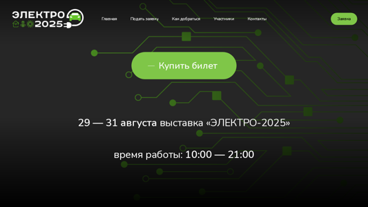 | AI-анализ | This website is for the "ЭЛЕКТРО-2025" international electric vehicle exhibition taking place in Minsk, Belarus. The title of the website is reflected in the name. The description mentions the dates of the event, which are August 29-31, 2025, and the working hours, which are 10:00-21:00. The website includes information about the event, such as its purpose and location, as well as a way to purchase tickets and submit inquiries for booth rentals or partnerships. The website also has a contact section with phone numbers and an email address. The top words used on the site include "электро-2025," "выставка," "контакты," and "заявка." The design of the website appears to be standard 2x2 grid |