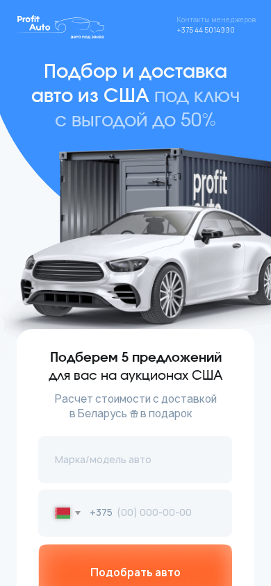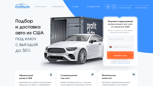 | AI-анализ | The portal helps users purchase American and Canadian cars under the key, offering delivery throughout Russia. The website provides assistance in selecting and importing vehicles, with free document processing, contract-based work, and independent vehicle diagnostics. Users can contact the team via phone for queries. The platform offers a 50% discount on car purchases, is an official dealer in the US, and provides key pickup services. It works with the Atlantic Express logistics company for cost-effective delivery. Users receive five potential car offers from US auctions and a free cost calculation with delivery to Belarus. The contacts of the managers are provided for inquiries. The website offers hot lots from US auctions that are worth bringing to Belarus and provides quick calculations under the key. The listings include a 2021 Audi Q5 Premium, a 2020 Chevrolet Malibu, a 2 |