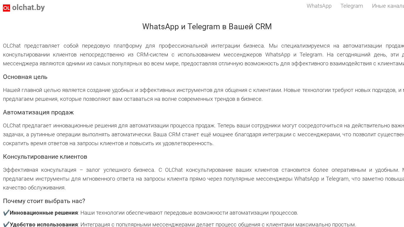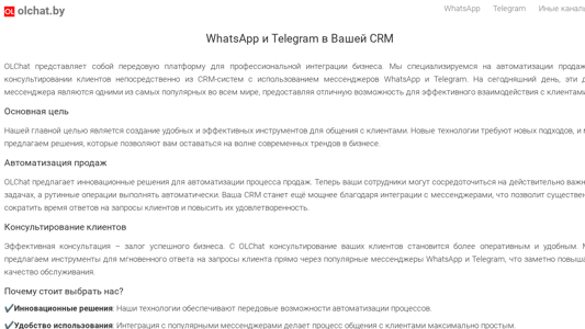 | AI-анализ | The website olchat.by offers a cutting-edge platform for professional business integration. Specializing in sales automation and client consulting directly from CRM systems using messengers WhatsApp and Telegram, this platform takes advantage of the popularity of these messengers for effective client interaction. With over 2 billion monthly active users combined, WhatsApp and Telegram provide excellent opportunities for efficient client communication. Our goal is to create user-friendly and efficient tools for client communication. New technologies require new approaches, and we offer solutions that allow you to stay ahead of business trends. Sales automation Olchat provides innovative solutions for automating the sales process. Your employees can focus on important tasks while routine operations are handled automatically. Your CRM will become even more powerful with messenger integration, enabling significant reduction in response times to client inquiries and increased client satisfaction. Client consulting Effective client consultation is essential for business success. With Olchat, client |