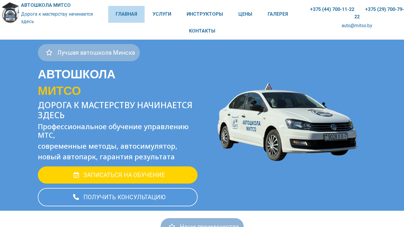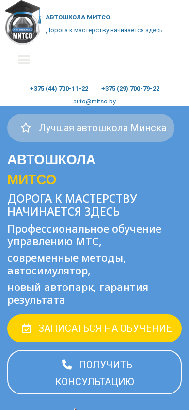 | AI-анализ | This website is the homepage of an auto driving school named "Mitso" in Minsk, Belarus. The title is "Главная" (Main) and the description includes keywords related to safety, auto school, group, Mitso, modern, auto park, our, education, gallery, contacts, and phone numbers with the country code "375". The website offers professional driving instruction using modern methods, an auto simulator, a new auto park, and a guarantee of results. Users can sign up for lessons and receive consultations. The advantages of the school include a modern building with multimedia equipment, a private driving range, a new auto park with the latest vehicles, and interactive training methods. The school also employs experienced female instructors and offers simulator training for complex driving scenarios. Users can choose from day and evening classes with group sizes of up to 30 students. The website features |