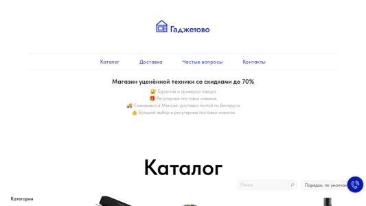 | AI-анализ | The web project "Гаджетово — экономия живет здесь" is a store selling discounted electronics with savings of up to 70% in Minsk, Belarus. The catalog offers regular deliveries of new items and free shipping for orders over 250 BYN. The store guarantees product inspections and customer satisfaction. Customers can test the items before purchase or have them delivered. Frequently asked questions address concerns about product condition and guarantees, with the site providing transparent descriptions and a return policy for non-functioning items. Delivery options include self-pickup in Minsk, next-day delivery within the city, and mail delivery throughout Belarus. |