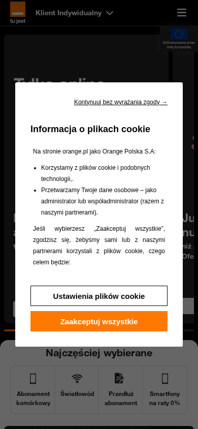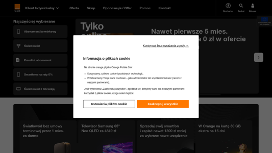 | AI-анализ | language: pl type: business category: telecommunications This online resource, titled "Internet, abonament komórkowy, telefony, telewizja | Orange Polska" (Internet, Mobile Plans, Phones, TV | Orange Poland), offers various packages combining mobile plans, internet, phones, and TV. The description mentions "szybki Orange Światłowód" (fast Orange Fiber Optic) and "telewizja" (TV). The keywords include "orange," "abonament," "komórkowy," "wiat," and "telefony" (Orange, mobile plans, telephones, and TV). The website is in Polish (language: pl) and is a business (type: business) within the telecommunications category (category: telecommunications). The use of cookies is mentioned in the footer of |