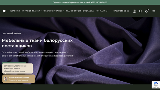 AI-анализ | This online resource is a Belarusian online store for fabrics. It offers the most comprehensive catalog of fabrics in Belarus, featuring 13 types of fabrics from five leading suppliers. The website boasts hundreds of colors, providing users with endless possibilities for various textures, shades, and patterns. The store's fabrics include velour, microvelour, jacquard, roghozka, flok, bukle, sheenill, printed, canvas, and other types. The store also offers a selection of premium and natural fabrics, as well as leather and laser-cut textiles. The website includes a contact number for a fabric consultant who can answer questions and help with fabric selection and orders. The store's main categories include velour, synthetic leather, synthetic fur, synthetic shag, synthetic wool, and other types of fabrics. The store's leading fabric |