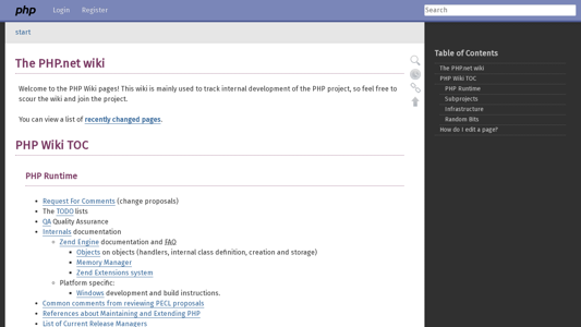AI-анализ | language: en This online resource, wiki.php.net, is the official wiki for the PHP project development. It primarily serves as a platform for tracking internal development, documentation, and infrastructure-related information. The wiki is open for public viewing, and interested individuals are encouraged to explore and join the project. The website includes sections on PHP runtime, request for comments, TODO lists, QA documentation, Zend Engine documentation, and various subprojects. Users with a PHP.net VCS account can log in and edit pages, while non-members can only view the content. The wiki also provides information on how to edit a page and access various tools such as page source, old revisions, and backlinks. The language used on the website is English. |