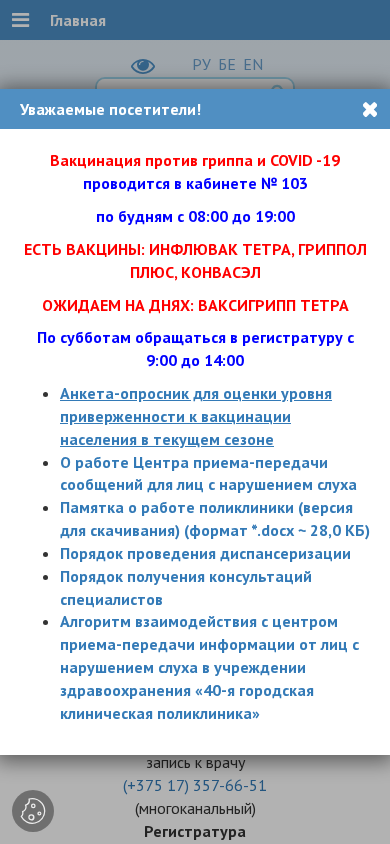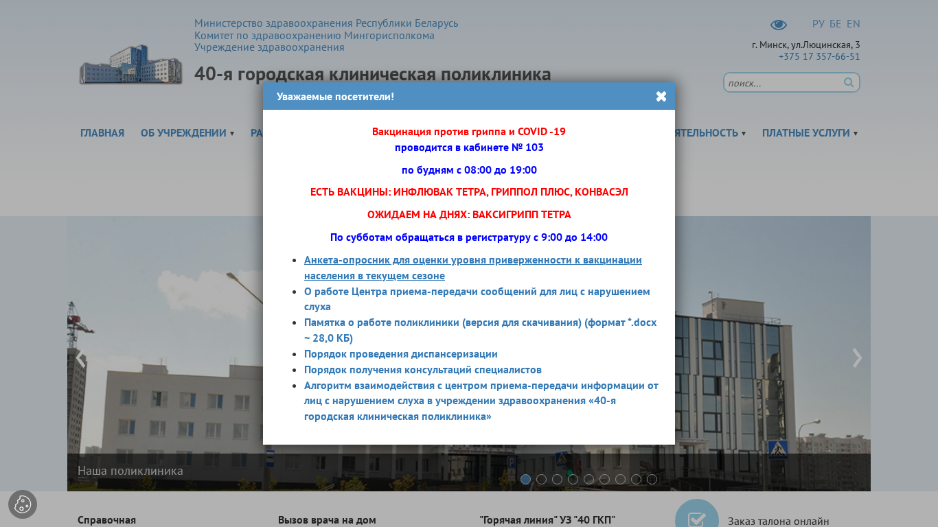 This website is for the 40-я городская клиническая поликлиника (40th city clinical polyclinic) of the city of Minsk, Belarus, located at ul.Lyucynskaya, 3. The website provides information about various departments, including the Administration, Preventive Care, General Practitioner Offices (1st, 2nd, and 3rd), Women's Consultation, Trauma-Surgical Department, Medical Rehabilitation Unit, Clinic-Diagnostic Laboratory, Regional Endoscopic Center No. 3, Day Stay Center, Centralized Sterilization Unit, Registration, Procedural Cabinet, Ultrasound Diagnostic Cabinet, Functional Diagnostic Cabinet, X-Ray Cabinet, Ophthalmology Cabinet, Neurology Cabinet, Endocrin