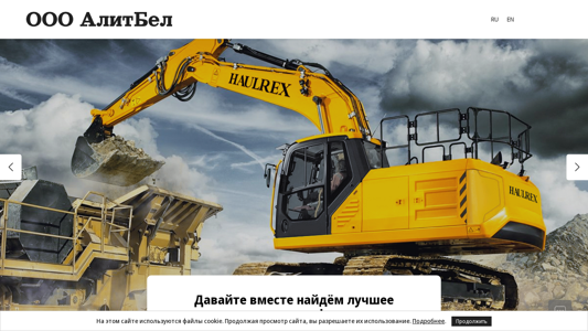--- This online resource, titled "Профессионалы в области карьерного и промышленного оборудования" (Professionals in the field of construction and industrial equipment), is the official website of OOO АлитБел (AlitBel). The homepage displays information about the company, its products and services, and contact details. The main product categories are construction technology, transport technology, and lifting equipment. The site also features a section for service and maintenance. The contact information includes a phone number, email address, and physical address in Minsk, Belarus. The site is multilingual, offering versions in Russian and English. The company's partners are listed, and visitors can subscribe to the newsletter. The site uses cookies, and by continuing to use it, users agree to their use.