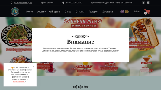 | SEO-описание | Ресторан узбекской кухни в Минске⭐Чайхана Бангалор⭐ Бесплатная доставка🔥 Минимальная сумма заказа 80 BYN ☎ +375 29 325 45 45 |