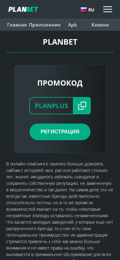 SEO-описание | PlanBet (2025) - это новое направление онлайн-гемблинга для ставок на спорт и игр в казино. Присоединяйтесь к 150 000 довольных игроков и откройте для себя первоклассный сервис и щедрые бонусы. |