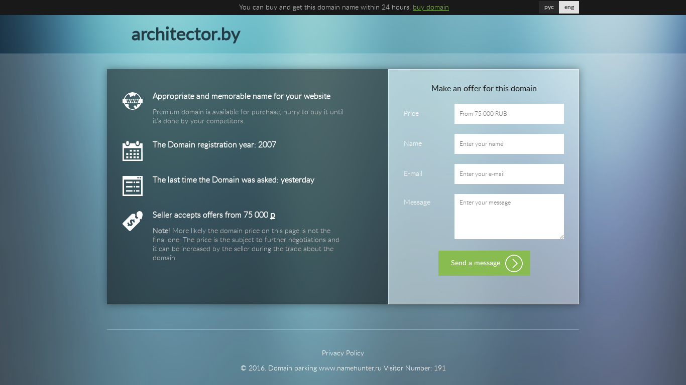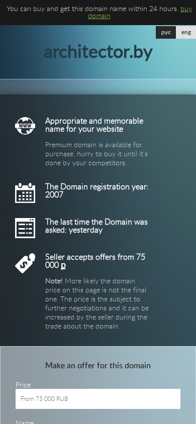 | AI-анализ | subdomain: path: extension: .by The portal architector.by is a premium domain name available for purchase since 2007. With over 190 visitors per year, it is an appropriate and memorable name for a website in the architecture or engineering industry. The domain can be obtained within 24 hours for a yet-to-be-negotiated price, as the seller is currently accepting offers starting from 75,000 ք. The domain registration was last updated yesterday. The website is currently parked and managed by NameHunter.ru. |