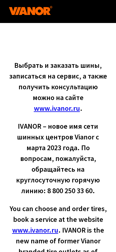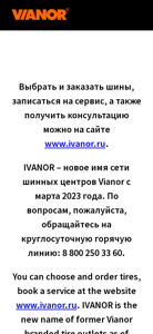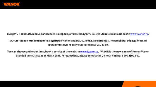 | AI-анализ | The web project "Vianor" is a tire and car service provider, with the new name "IVANOR" and a new website at www.ivanor.ru. The website offers the ability to choose and order tires, book a service, and receive consultation. The company transitioned from the Vianor brand to the new name in March 2023. Customers can contact a 24-hour hotline for inquiries. Vianor ensures safe and comfortable driving through its complete tire and car services. The company offers service packages as part of its one-stop principle, providing easy, fast, high-quality, and reliable services. At Vianor, customers can find various tire types and a wide range of car services. The specific services offered may vary from shop to shop. |