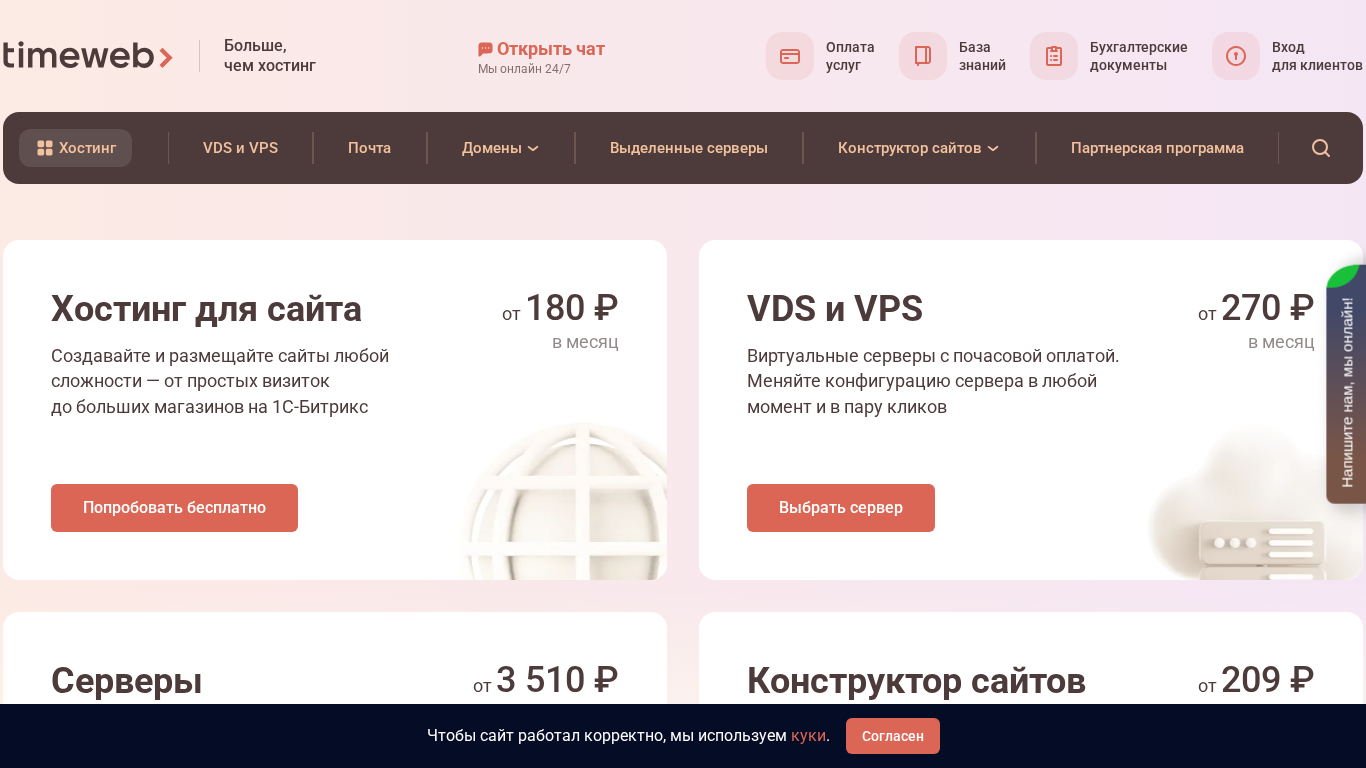 | SEO-описание | Timeweb - Аренда виртуального хостинга для сайтов. Хостинг для CMS. Регистрация и продление доменов. Почта для бизнеса. Продажа SSL-сертификатов, лицензий 1С-Битрикс. Конструктор сайтов. |
