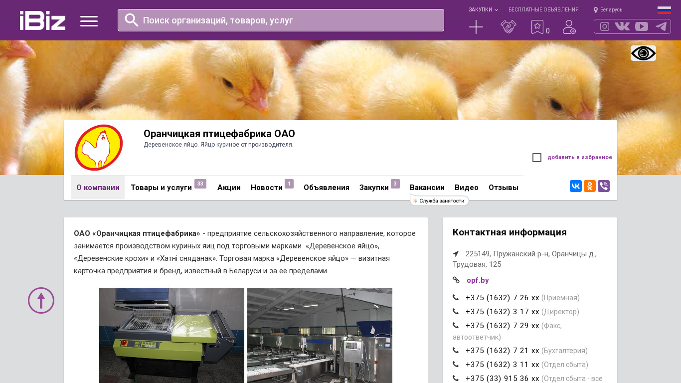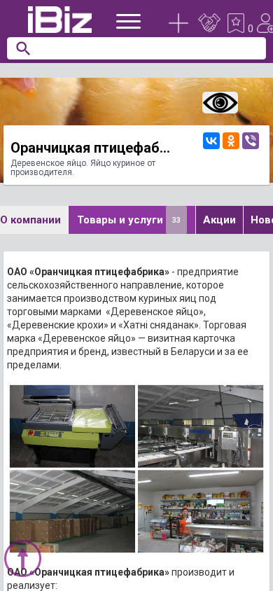 | AI-анализ | The web project "Oранчицкая птицефабрика ОАО - Деревенское яйцо" is a Belarusian agricultural enterprise specializing in the production and sale of chicken eggs under the brand names "Деревенское яйцо", "Деревенские крохи", and "Хатні сняданак". The company's flagship brand, "Деревенское яйцо", is widely recognized in Belarus and beyond. OАО "Оранчицкая птицефабрика" produces and sells various chicken egg products, including white chicken eggs, vacuum-packed eggs, and packaged eggs. Additionally, they offer poultry meat, live poultry, and poultry by-products. The enterprise places a strong emphasis on food safety and product quality, adhering to strict sanitary and hy |