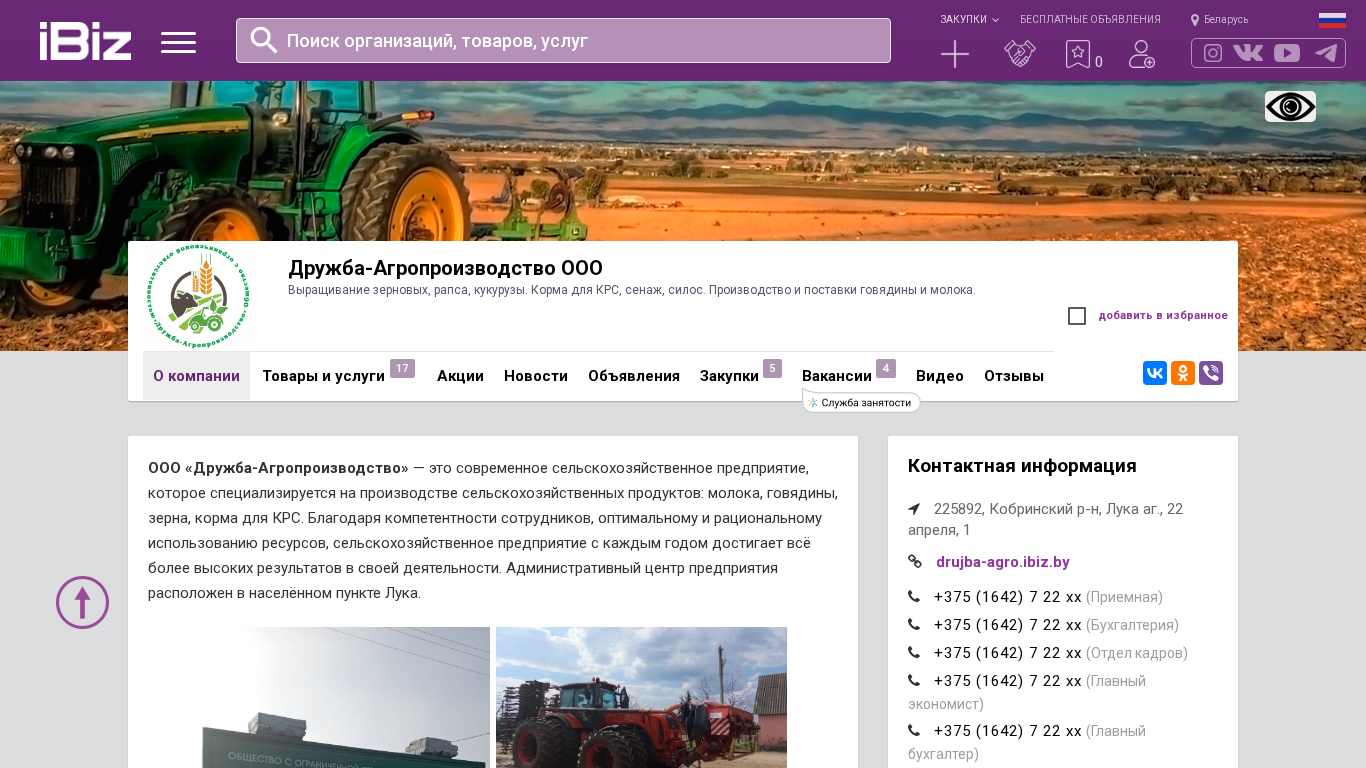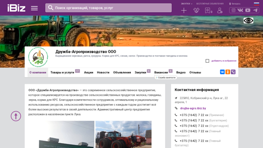 | AI-анализ | This online resource represents OOO "Druzhba-Agroproduktsio," a modern agricultural company focusing on the production of agricultural products, including milk, beef, grain, corn, silage, and hay. The organization boasts a competent team and efficient resource management, leading to continuous improvement in their operations. The administrative headquarters of the company are located in the village of Luka. OOO "Druzhba-Agroproduktsio" offers a diverse range of products, including grains, rapeseed, milk, livestock, silage, and hay. The company's assets include livestock and dairy farms, storage and warehousing facilities, milling plants, zernosukharny complexes, transport fleet, and repair workshops. We guarantee top-notch product quality, competitive prices, and personalized customer service. The company is headed by Alexander Ivan |