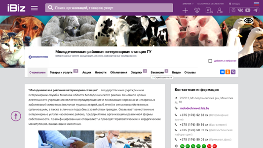 | AI-анализ | The portal Molodechnovet.ibiz.by is a government veterinary station in the Minsk region of Moldochno District, Belarus. Its primary objective is to prevent and eliminate infectious and non-infectious diseases among farm animals, as well as among wild animals, bees, and fish in agricultural enterprises and private households within the district. The station offers quality veterinary services to the local population, businesses, and organizations. Qualified personnel perform therapeutic and surgical procedures, vaccinate animals, and run a diagnostic laboratory. The laboratory conducts tests on animal feed, wastewater, blood samples, and pathological material, as well as radiological and trichinosis (compression) testing of samples taken from wild boars. The station's quick response, high-quality services, and availability of necessary medical instruments and equipment enable veterinarians to provide assistance promptly, |