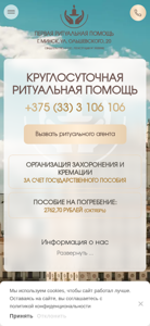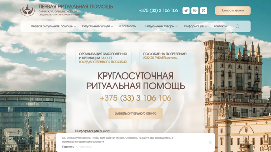 | AI-анализ | This website is a funeral bureau in Minsk, Belarus, with the title "Ритуальные услуги в Минске - Похоронное бюро" and registration number 193359982. The description includes a range of ritual services offered, such as organizing funerals, cremation, body storage in a morgue, transportation of the deceased, rental of a hearse, and burial services. The website also offers additional services like balzamation, rental of a ritual hall, organizing a wake, and rental of a cold storage room. The contact information includes a phone number (33 106 106) and an email address (ritualhelp2025@gmail.com), and the address is given as ul. Oльшевского, 20 in Minsk. The |