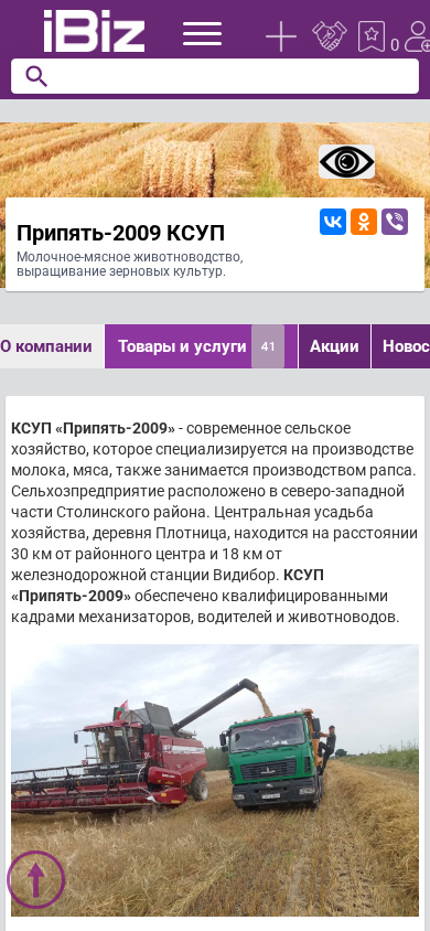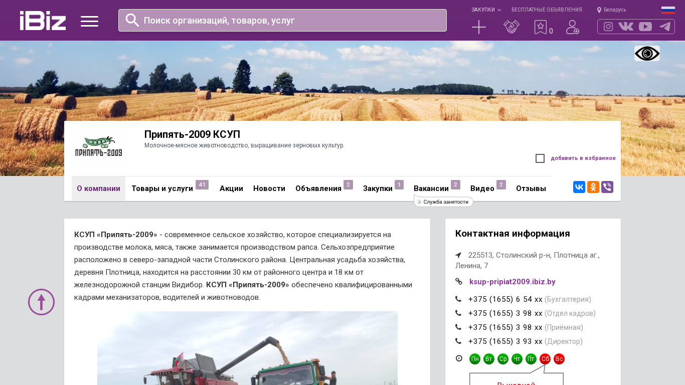 This website is for Pripять-2009 KСУП, a farming enterprise specializing in dairy and meat production, as well as growing crops, specifically cereals and rapeseed. The company is located in the northwestern part of Sтолинский район, with its central farmstead in the village of Плотница, which is 30 km away from the district center and 18 km from the railway station Видибор. Pripять-2009 KСУП employs skilled workers in agriculture, including mechanics, drivers, and livestock farmers. The main areas of activity for Pripять-2009 KСУP include: cereal cultivation, cultivation of fodder crops, rapeseed production, and dairy-meat livestock farming. The enterprise covers a total area of 8,2