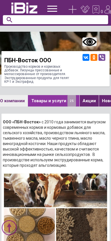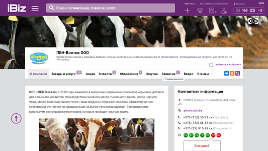 | AI-анализ | The website is for PBN-Vostok OOO, a company based in Grodno, Belarus, specializing in the production of animal feed and feed additives. The site offers pressed and melassated lizunts (cakes) and extruded products for cattle, specifically KR-1 and Extraphid. The company also produces various types of oils, including flaxseed, pumpkin seed, black tallow, and grape seed oil. The products are known for their high efficiency, quality, and innovation in the agricultural market. The production process includes the use of extruded feed, which undergoes alkalization. The company offers targeted feed additives, such as concentrated feed for livestock, a protein-rich feed mixture, and growth promoters for cattle. The equipment is capable of accurately dosing ingredients during the production of dry mixes and can automatically introduce |