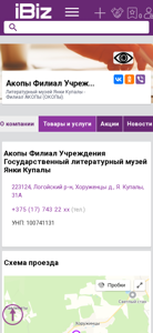 | AI-анализ | The portal akopy.ibiz.by is a branch of the State Literary Museum of Yanaki Kupala, also known as the Literary Museum Yanaki Kupaly - Filial AKOPY (OKOPY). It is located in Horuzheny d., Y. Kupaly, 31A, in Lohisky region, Belarus, with the postal code 223124. The website provides information on the museum's location, contact telephone numbers, and company details, including its Unified State Register number 100741131. The portal features various sections, such as 'News', 'Announcements', 'Actions', and 'Vacancies'. Users can also find information on the museum's opening hours, which are from 10:00 to 17:00 on weekdays, except for |