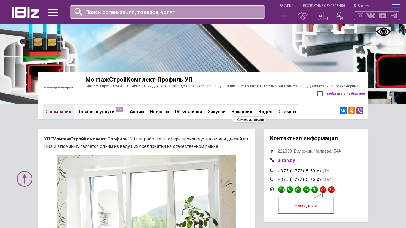 | Название / Заголовок | МонтажСтройКомплект-Профиль УП - Системы профилей из алюминия, ПВХ для окон и фасадов. Технические консультации. Стеклопакеты клееные однокамерные, двухкамерные и трехкамерные.. 222358, Воложин, , Чапаева, 54А |