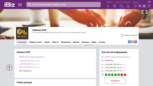 | AI-анализ | The portal Alvekon OOO is a Belarusian company based in Pinsk, offering PVC windows and doors, as well as water drainage and ventilation systems. Keywords associated with the company include 'установка пластиковых окон' (installation of plastic windows), 'продажа окон пвх' (sale of PVC windows), 'изготовление окон пвх' (manufacturing of PVC windows), 'изготовление пвх дверей' (manufacturing of PVC doors), and various other related terms. The company can be contacted via multiple phone numbers, including +375 (44) 797 43 xx, +375 (29) 607 16 xx, and +375 (29) 944 17 xx. Office hours |