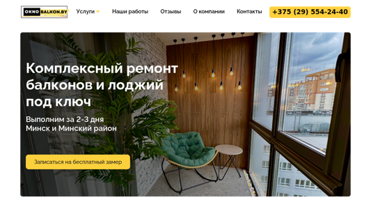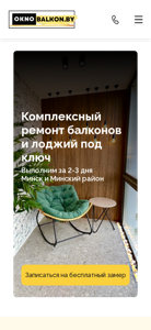| AI-анализ | --- This website is for a company named OKNOBALKON in Minsk, Belarus, specializing in balcony installation under the key. The title is "Балконы под ключ в Минске" (Balconies under the key in Minsk). The description mentions getting a free measurement by submitting an online form and receiving a call back. The website offers a clickable button for submitting the form and signing up for the company's confidentiality policy. The company also mentions job opportunities and training for those skilled in window installation, aluminum frames, or balcony finishing. The website also provides services for window and frame repair, mebel for balconies, roll shades, and offers a discount for the month mentioned. The company has been in business for 15 years, with over 1500 completed projects. The services include balcony finishing, window |