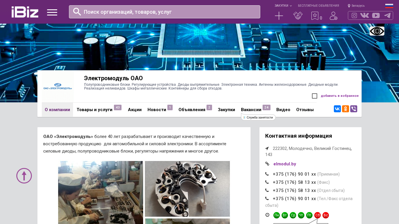 | Название / Заголовок | Электромодуль ОАО - Полупроводниковые блоки. Регулирующие устройства. Диоды выпрямительные. Электронная техника. Антенны железнодорожные. Диодные модули. Реализация неликвидов. Шкафы металлические. Контейнеры для сбора отходов.. 222302, Молодечно, , Великий Гостинец, 143 |