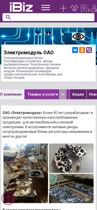 | AI-анализ | The web project "Electromodule OAO" offers a wide range of semiconductor blocks, regulating devices, rectifier diodes, electronic equipment, railway antennas, diode modules, scrap container solutions, and other related products. With over 40 years of experience in developing and manufacturing high-quality and in-demand products for the automotive and power electronics industries, the company's catalog includes: Semiconductor blocks; Regulating devices; Rectifier diodes; Electronic equipment; Railway antennas; Diode modules; Metal enclosures; and Scrap container solutions. Additionally, the company offers metalworking and metal coating services. Major industry partners rely on Electromodule OAO for their production needs. The company's team of experts is always ready to consult on services, products, and sales-related inquiries, ensuring high product quality, reasonable prices, and individual |