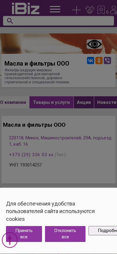 | AI-анализ | This website is a business located in Minsk, Belarus, with the address at Машиностроителей, 29А, подъезд 1, каб. 16. The company, named Fuelfilter OOO, specializes in selling filters for import machinery used in agriculture, road construction, and special technology. They offer filters from leading global manufacturers. The website provides a contact number, +375 (29) 336 03 xx, and an UNP (unified taxpayer number) of 193014257. The business operates from Monday to Friday, 09:00 to 18:00, without breaks for lunch. The company is listed under the categories of automotive oils and lubricants, and automotive filters in Minsk. |