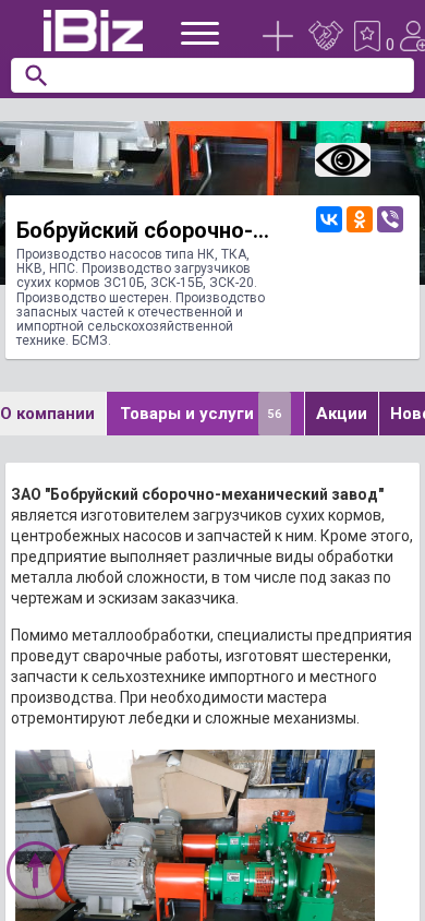 AI-анализ | The portal is a manufacturing company, Bobruisk Mechanical and Assembly Plant ZAO (БСМЗ), specializing in the production of various types of pumps, including НК, ТКА, НКВ, and НПС models. The company also manufactures dry feed loaders, such as ЗС10Б, ЗСК-15Б, and ЗСК-20, as well as gears and spare parts for domestic and imported agricultural machinery. The website provides information about the company's products and services, including metalworking and swaging, and offers a contact address and phone numbers. |