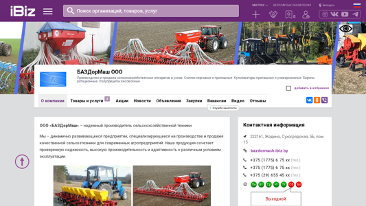 Название / Заголовок | БАЗДорМаш ООО - Производство и продажа сельскохозяйственных аппаратов и узлов. Сеялки зерновые и пропашные. Культиваторы пропашные и универсальные. Бароны ротационные. Полуприцепы лесовозные.. 222161, Жодино, , Сухогрядская, 5Б, пом. 15 |
