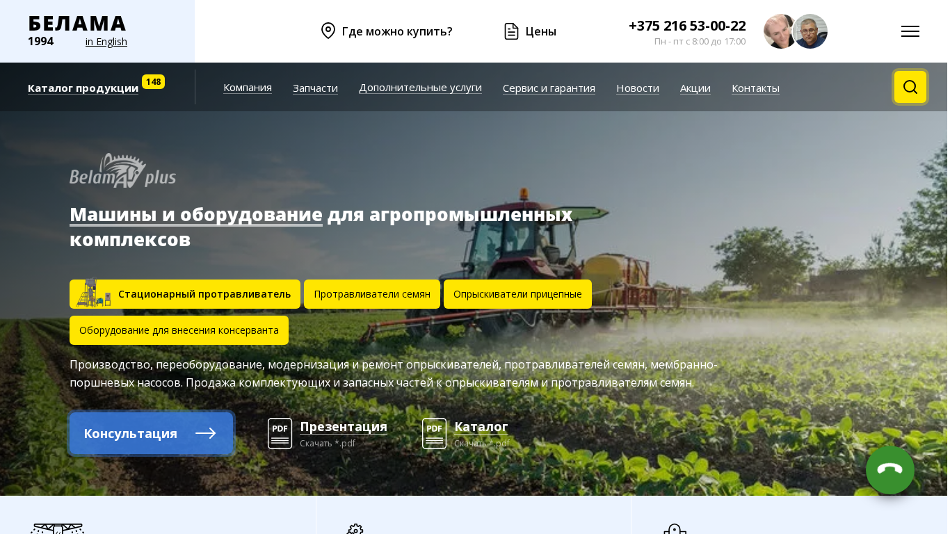 | AI-анализ | The web project "Belama" is an agricultural industrial complex offering production, conversion, modernization, and repair services for various types of sprayers, seed drills, and membrane-piston pumps. The site sells components and spare parts for these machines. Keywords associated with the site include "agroindustrial complexes," "equipment," "Belama," "technology," "repair," "seed drills," "sprayers," "parts," and "agriculture." The company also provides equipment for applying conservant to press-harvesters and corn harvesters, as well as equipment for potato cultivation and transportation, packaging, and storage. The site offers a range of machinery for applying complex fertilizers, seeding equipment, and components for these machines. Belama's product line includes soft tanks for agriculture and industry, filtering systems, and various types of |
