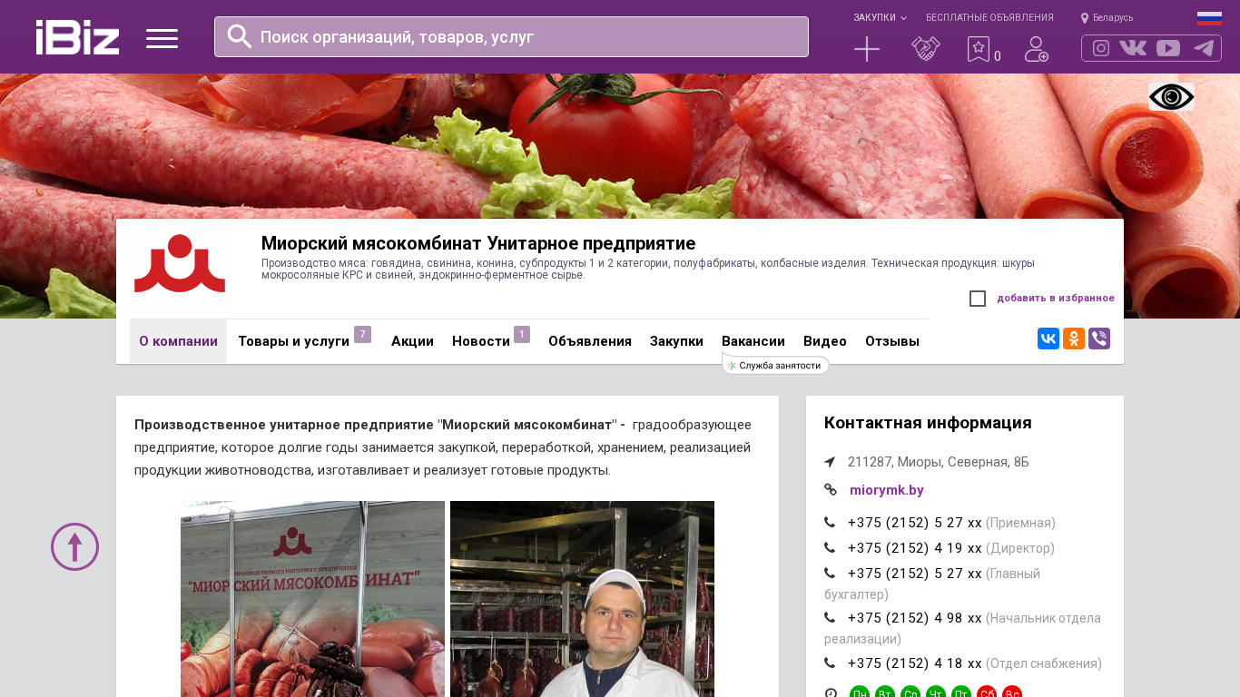 | Название / Заголовок | Миорский мясокомбинат Унитарное предприятие - Производство мяса: говядина, свинина, конина, субпродукты 1 и 2 категории, полуфабрикаты, колбасные изделия. Техническая продукция: шкуры мокросоляные КРС и свиней, эндокринно-ферментное сырье.. 211287, Миоры, , Северная, 8Б |