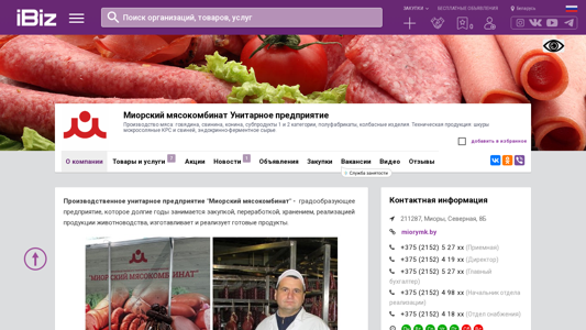 | AI-анализ | --- The web project "Miory Meat Combine" is a production enterprise specializing in the processing and sale of meat products. The company produces and sells beef, pork, horse meat, sub-products of the first and second categories, semi-finished products, and various sausages. In addition, the enterprise deals with technical production, including salted wet hides of cattle and pigs, and endocrine-ferment raw materials. The address of the company is 211287, Miory, Northern district, 8B. The website contains information about the company, its products and services, as well as contact details and a scheme for reaching the location. Keywords: meat, sausages, production, enterprise, technical production, hides, ferment raw materials. |