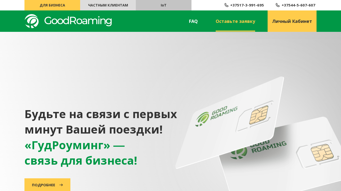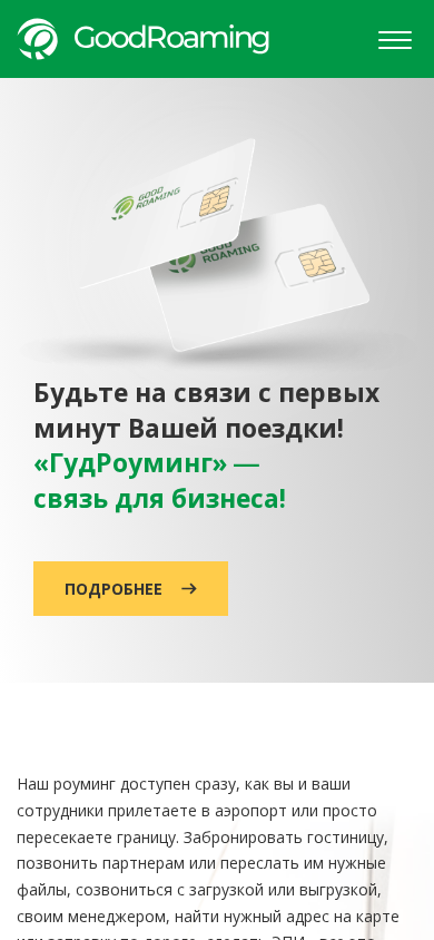 | SEO-описание | ГудРоуминг - честный роуминг для всех ваших поездок! Мобильный интернет от 5$ за Гб, звонки – от 0.25$ за минуту. Нет абонентской платы. |