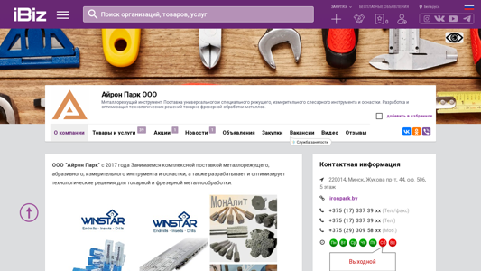 Название / Заголовок | Айрон Парк ООО - Металлорежущий инструмент. Поставка универсального и специального режущего, измерительного слесарного инструмента и оснастки. Разработка и оптимизация технологических решений токарно-фрезерной обработки металлов.. 220014, Минск, , Жукова пр-т, 44, оф. 506, 5 этаж |