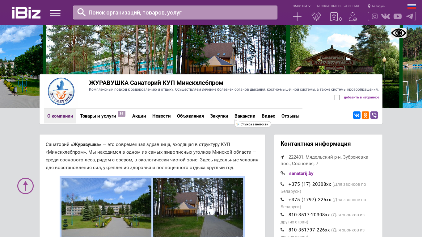 | Название / Заголовок | ЖУРАВУШКА Санаторий КУП Минскхлебпром - Комплексный подход к оздоровлению и отдыху. Осуществляем лечение болезней органов дыхания, костно-мышечной системы, а также системы кровообращения.. 222401, , Зубреневка пос., Сосновая, 7 |