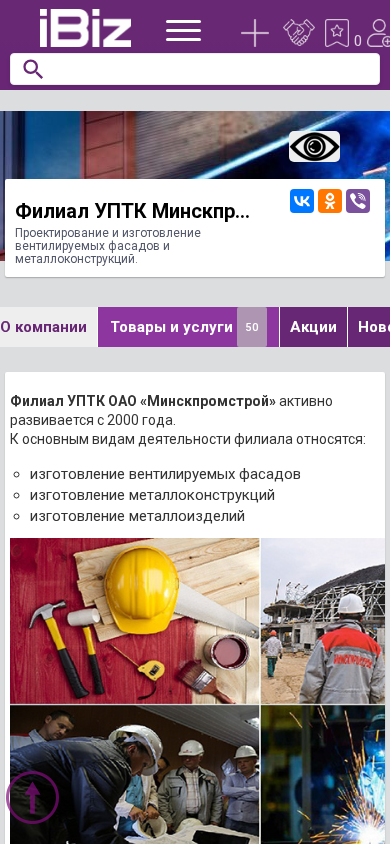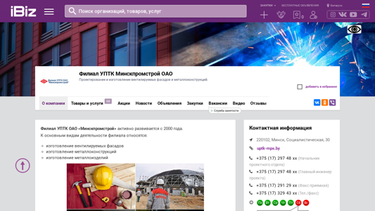 | AI-анализ | This website is the online presence for the Minskpromstroy OAO branch of UPTK in Minsk, Belarus. The company specializes in the design and production of ventilated facades and metal structures. The address for the physical location of the branch is given as 220102, Sociallisticheskaya 30 in Minsk. The website also provides some contact information, including phone numbers and the company name. Keywords associated with the website include "services," "manufacturing," "branch," "uptk," "minskpromstroy," "oao," "ventilated facades," "metal structures," "purchases," "announcements," "company," "technology," "equipment," "rental," "without," "lunch," "Minsk," and "metal products." The website appears |