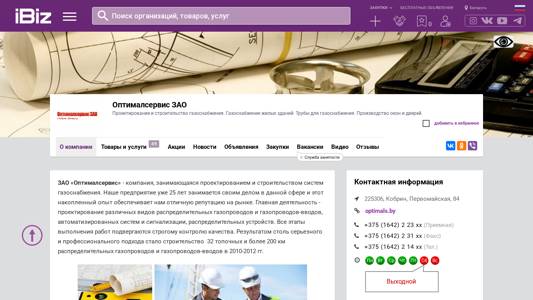| AI-анализ | language: ru The website is for Optimalservis ZAO, a company specializing in designing and constructing gas supply systems for residential buildings. They also produce windows and doors. With 25 years of experience in the field, the company has built over 32 top-notch and more than 200 km of distribution and intake gas pipelines and automated systems between 2010 and 2012. Their services and products include gas supply system construction, project design, engineering services, and window and door production. The website includes a section for company information, goods and services, news, job postings, videos, and customer reviews. The contact address is given as Cobrin, Pervomayasaka, 84. |