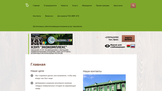 | AI-анализ | --- The website <ekokompleks.by> is dedicated to the company "ЭкоКомплекс" specializing in waste management services. The main sections of the site include information about the company's leadership, work schedule, organizational structure, technological process of sorting secondary material resources, and efforts against corruption. There are also sections on legislation, personal data, news, and reports. Services offered include collection and disposal of solid communal waste, large-scale waste, and construction waste, as well as auto services for legal and physical entities. The site provides contacts for inquiries and vacancies, and information on days for waste collection. The company aims to make the world around them cleaner by reducing the negative impact of waste on the environment and providing high-quality residential and communal services. The site also features a section for contacts, including the company director's name and contact information, as well as |