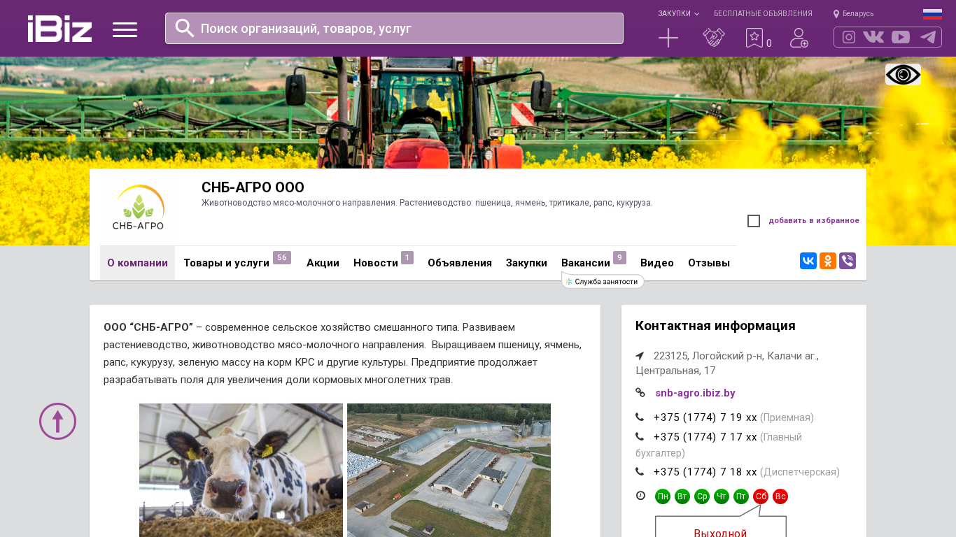 | Название / Заголовок | СНБ-АГРО ООО - Животноводство мясо-молочного направления. Растениеводство: пшеница, ячмень, тритикале, рапс, кукуруза.. 223125, , Калачи аг., Центральная, 17 |