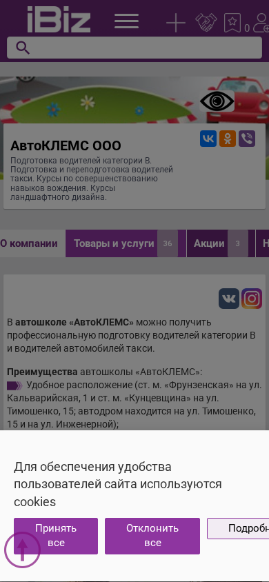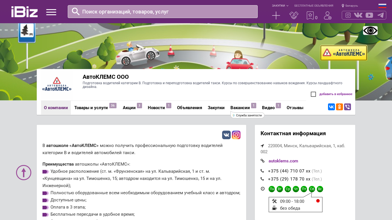 | Название / Заголовок | АвтоКЛЕМС ООО - Подготовка водителей категории В. Подготовка и переподготовка водителей такси. Курсы по совершенствованию навыков вождения. Курсы ландшафтного дизайна.. 220004, Минск, , Кальварийская, 1, каб. 002 |