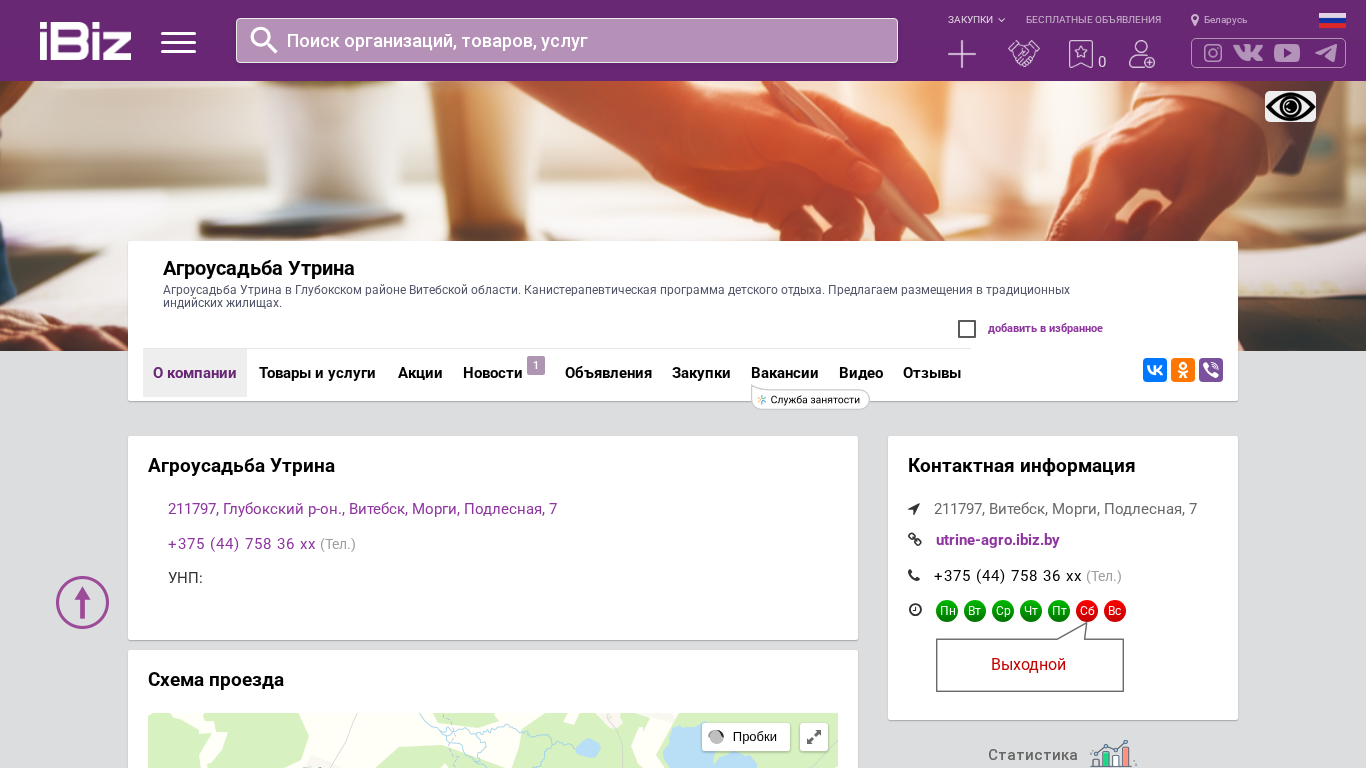 | AI-анализ | This website is for Agro-Estate Utrina located in the Gluboksky region of Vitsebsk, Belarus. It offers a canisterapeutic children's recreation program and accommodation in traditional Indian houses. The website includes a map scheme, contact telephone numbers, and the company's Unified State Register number. It is a platform for buying goods and services, featuring green tourism, agro-tourism, and ecotourism, as well as child recreation, leisure, and entertainment. The company's opening hours are Monday to Friday from 9:00 to 18:00 without lunch, and weekends are days off. |
