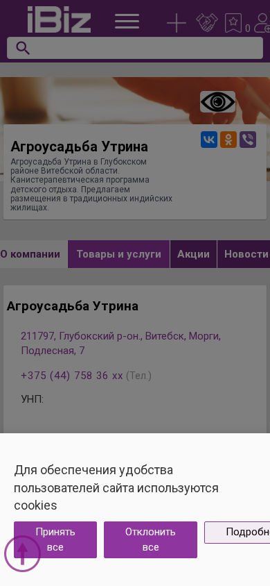 | Название / Заголовок | Агроусадьба Утрина - Агроусадьба Утрина в Глубокском районе Витебской области. Канистерапевтическая программа детского отдыха. Предлагаем размещения в традиционных индийских жилищах.. 211797, Витебск, , Морги, Подлесная, 7 |