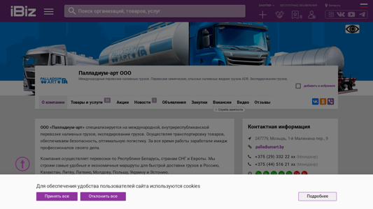 | AI-анализ | --- This website belongs to OOO Palladium-art, a company based in Мозырь, Belarus, with the address 1-й Малинина пер., 9. The main focus of the business is on international and domestic transport of bulk goods, as well as expediting shipments. The company specializes in handling hazardous and chemical liquid cargo in accordance with ADR regulations. The website provides information on the company's location, contact numbers, and services. OOO Palladium-art operates in Belarus and countries within the CIS and Europe, offering efficient and economical shipping routes for quick cargo delivery to Russia, Kazakhstan, Lithuania, Latvia, Moldova, Poland, Ukraine, and Estonia. The company has a large fleet of specialized vehicles for transporting food and industrial products while maintaining their quality and appearance. OOO Palladium-art |
