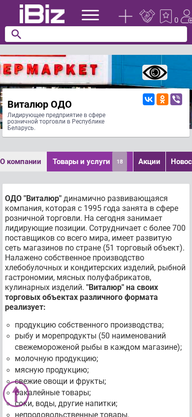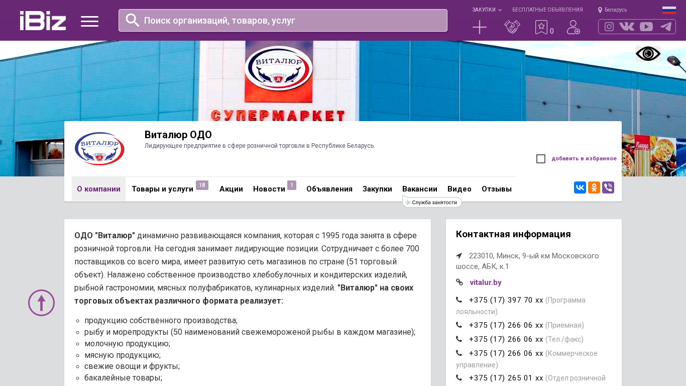 | AI-анализ | This website is for the Belarusian company "Виталюр ОДО" (Vitalur ODO), which is the leading enterprise in the retail sector in the Republic of Belarus. The address and contact information are provided: 223010, Минск, , 9-ый км Московского шоссе, АБК, к.1. The company specializes in retail trade and works with over 700 suppliers worldwide. It operates 51 retail locations across the country and has its own production of bakery and confectionery items, fish market, meat processing, and culinary products. The company sells its own products, fresh fish and seafood (50 varieties in each store), dairy products, meat products, fresh vegetables and fruits, canned goods, juices, waters, and other non-food items at its various |