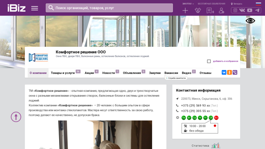 | AI-анализ | The web project "Комфортное решение ООО" is a company based in Minsk, Belarus, specializing in the production and installation of PVC windows, doors, balcony frames, balcony and loggia glass installations. The company employs a team of 20 experienced professionals who ensure quality workmanship. The product range includes PVC windows, balconies, doors, garden glass installations, kitchens, wardrobes, and various accessories. The company has its own production facility where quality control is strictly enforced, and all products come with certifications. Customers can contact the company using the phone number +375 29 569-93-74 for more information or to place an order. The website also provides a map with directions to the company's office located at Скрыганова, 6, оф. |