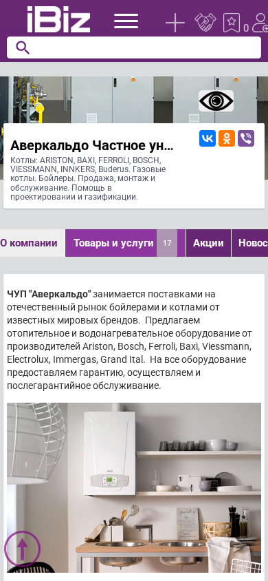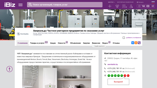| Название / Заголовок | Аверкальдо Частное унитарное предприятие по оказанию услуг - Котлы: ARISTON, BAXI, FERROLI, BOSCH, VIESSMANN, INNKERS, Buderus. Газовые котлы. Бойлеры. Продажа, монтаж и обслуживание. Помощь в проектировании и газификации.. 230023, Гродно, , 17 сентября, 49, офис 107 |