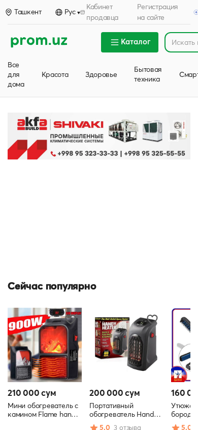 | AI-анализ | --- The web project Prom.uz is a business trading platform based in Tashkent, Uzbekistan. It offers buying and selling of goods and services, as well as tenders. Products and services listed include various categories such as home goods, beauty, health, home appliances, smartphones, auto repair, construction, and more. Prices range from 210,000 to over 6,700,000 sums, and delivery is available for some items. Examples of products include a portable heater, an electric muscle stimulation device, a massage cushion, a children's vacuum cleaner, and beard oil. The platform also features various deals and discounts. |