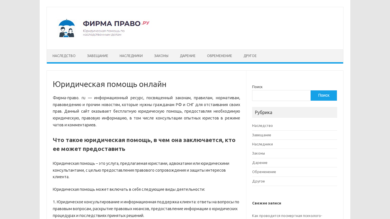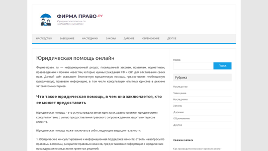 | AI-анализ | --- The portal Firma-pravo.ru is a legal resource, offering hundreds of legal articles on inheritance matters and convenient navigation to find relevant information. The website caters to the needs of Russian and CIS citizens in upholding their rights, providing free legal assistance and legal, regulatory information, including consultations from experienced lawyers via chat and commentary. This site offers legal assistance, a service provided by lawyers, attorneys or legal consultants, aimed at legal guidance and protection of clients' interests. The scope of legal assistance includes:  1. Legal consultation and informational support: answering legal queries, clarifying legal nuances, and providing information on legal procedures and consequences of decisions. 2. Preparation and analysis of legal documentation: drafting and reviewing contracts, protocols, claims, appeals, complaints, and other documents related to legal matters. 3. Participation in negotiations and representation of |